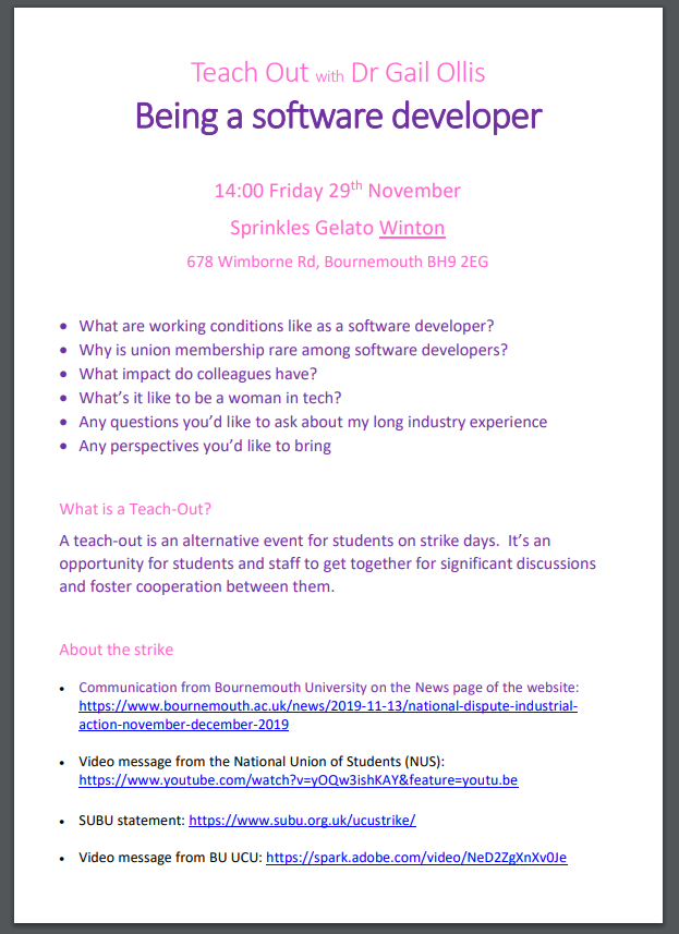 Dr Sam Goodman ‘Radical Spaces: Picket Lines, Protest & the Politics of Place’ ucu-bu-teach-out-goodmanDownload Dr Gail Ollis ‘Being a Software Developer’
